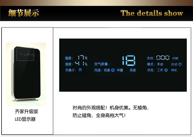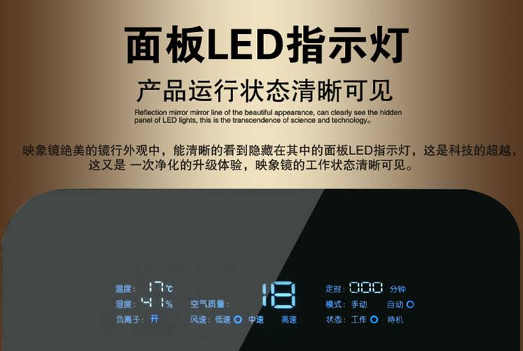 空气净化器面板特点:映象镜面绝美的镜行外观中,能清晰的看到隐藏在其中的LED面板指示灯,这个是科技的超越,这又是一次净化的审计体验,映象镜面的工作状态清晰可见。